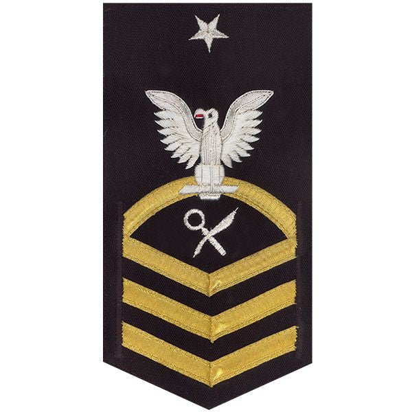 Navy rating badge E-8 Vanchief silver eagle with gold lace chevrons on blue is intelligence specialist - individually priced. Please allow 2-4 weeks for delivery.