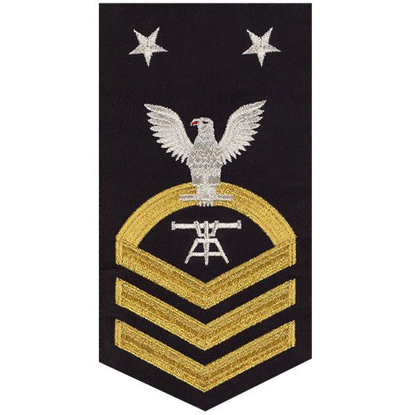Navy rating badge E-9 seaworthy-all machine made eagle and center with embroidered gold embroidered on blue ft fire control technician.