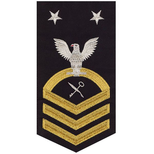 Navy rating badge E-9 seaworthy-all machine made eagle and center with embroidered gold embroidered on blue (RS) Retail Services Specialist.