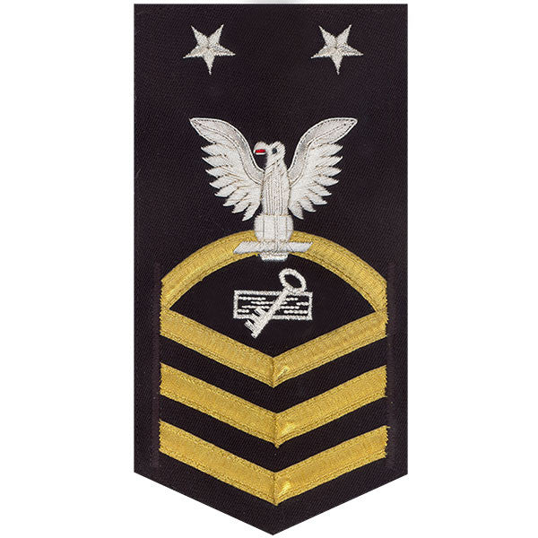 Navy rating badge E-9 Vanchief silver eagle with gold lace chevrons on blue dk disbursing clerk - individually priced. Please allow 2-4 weeks for delivery.