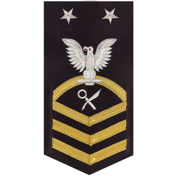 Navy rating badge E-9 Vanchief silver eagle with gold lace chevrons on blue is intelligence specialist - individually priced. Please allow 2-4 weeks for delivery.